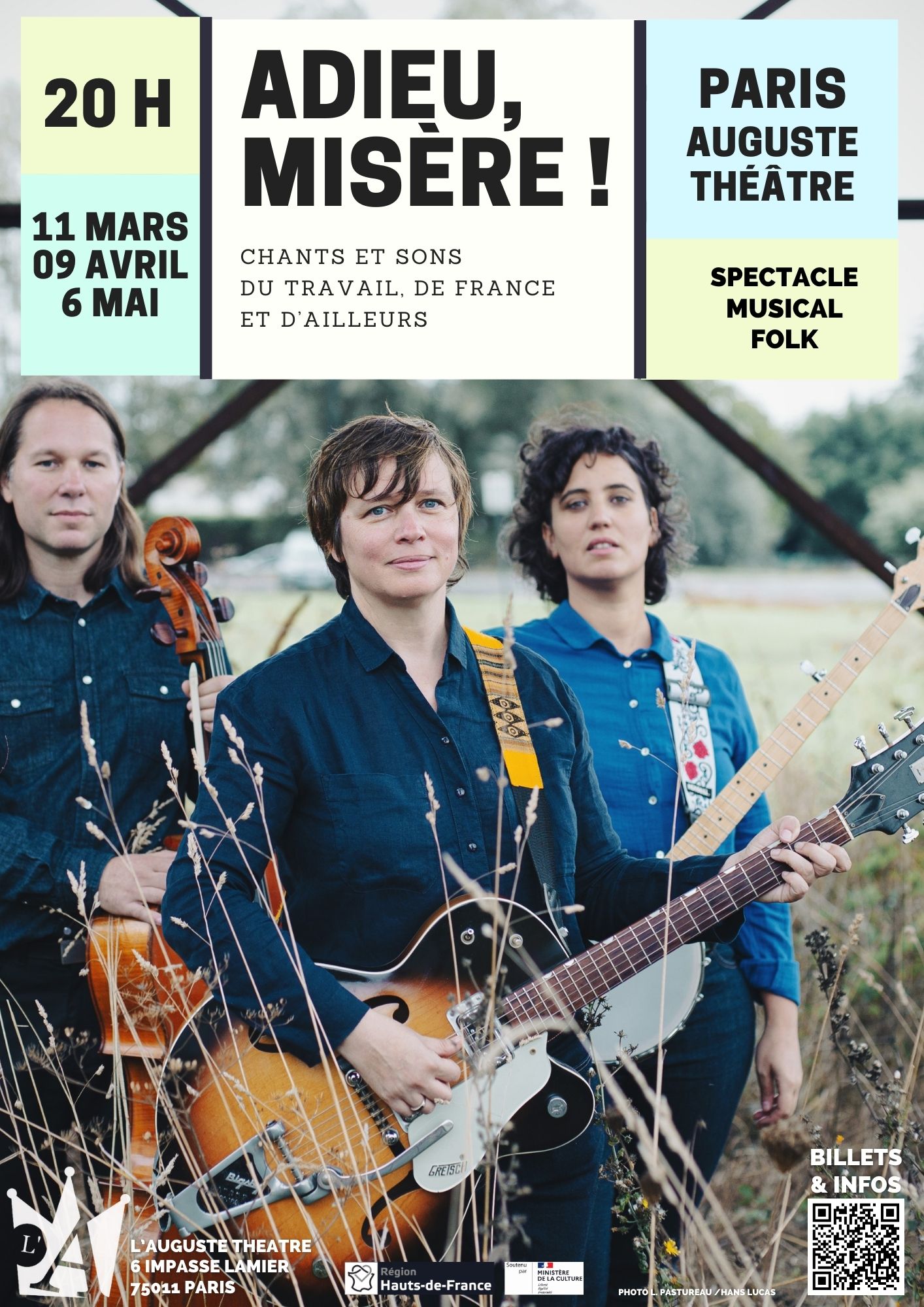 « Adieu, Misère ! » est un spectacle musical et polyglotte qui fait vivre sur scène des chants du travail du monde entier. L’orchestration acoustique (voix, guitares, banjo, violoncelle) se mêle à des sons industriels pour incarner le dialogue musical entre les travailleur·ses et leur environnement sonore.