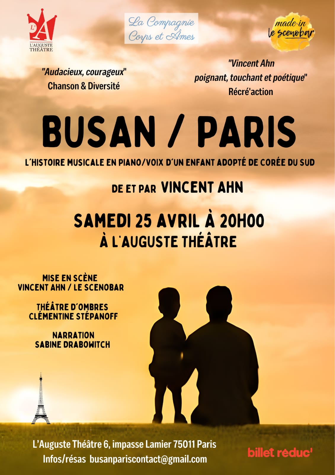 Busan / Paris raconte cette rencontre bouleversante entre un homme et un enfant, un père et son fils, à travers les chansons et textes de Vincent Ahn et le théâtre d’ombres de Clémentine Stépanoff.